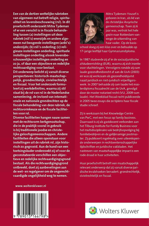 Dit proefschrift is het eerste integrale onderzoek naar de juridische status en fiscale rechtspositie van religieuze, spirituele en levensbeschouwelijke anbi's, waarbij tevens een vergelijking wordt gemaakt met de juridische status en fiscale rechtspositie van andere anbi's. Daarnaast vergelijkt de auteur de civielrechtelijke aspecten van de drie rechtsvormen; stichting, vereniging en kerkgenootschap. Deze publicatie bevat een uitgebreid overzicht van juridische en niet- juridische definities van religie, spiritualiteit en levensbeschouwing. Voor de juridische definities onderzoekt de auteur universele, Europese en nationale rechtsbronnen.