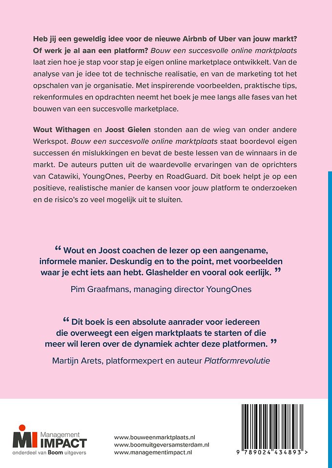 Heb jij een geweldig idee voor de nieuwe Airbnb of Uber van jouw markt? Of werk je zelfs al aan een platform? 'Bouw een succesvolle online marktplaats' is hét boek over marketplaces geschreven door ondernemers die alle valkuilen hebben gezien en echte successen hebben