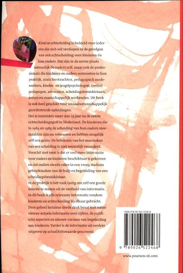 Het is inmiddels meer dan 25 jaar na de eerste echtscheidingsgolf in Nederland. De kinderen die in 1984 en 1985 de scheiding van hun ouders meemaakten zijn nu volwassen en hebben mogelijk zelf een gezin. De betekenis van het meemaken van een scheiding is niet wezenlijk veranderd. Verschil met toen is dat er veel meer informatie voor ouders en kinderen beschikbaar is gekomen en dat ouders steeds vaker in een vroeg stadium gebruikmaken van de hulp en begeleiding van een scheidingsbemiddelaar. In de praktijk is het vaak lastig om zelf een goede selectie te maken uit de veelheid van informatie. In dit boek is alle relevante informatie rondom kinderen en echtscheiding bij elkaar gebracht. Deze geheel herziene derde druk bevat met name nieuwe actuele informatie over cijfers, de juridische aspecten en nieuwe vormen van begeleiding aan kinderen. Verder is de informatie uit eerdere uitgaven op actualiteitswaarde gescreend.