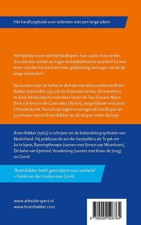 Na boeken over de halve en de hele marathon verkende Bram Bakker (inmiddels 55) ook de afstanden áchter de marathon. In Zuid-Afrika liep hij meerdere keren de Two Oceans Marathon (56 km) en de Comrades (89 km), vergelijkbaar met onze Elfstedentocht. Vanuit zijn eigen ervaringen als hardloper en psychiater neemt Bram Bakker de ultraloper onder de loep.
