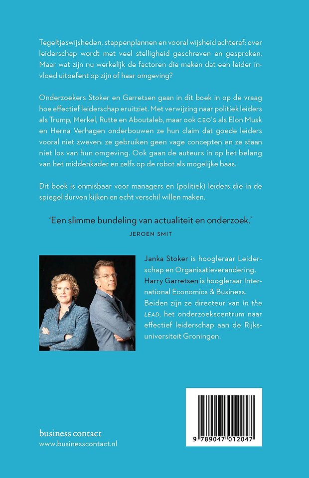 Onderzoekers Stoker en Garretsen beantwoorden in dit boek de vraag hoe effectief leiderschap eruitziet. Met verwijzing naar de actualiteit, sport en politiek en aan de hand van bekende bedrijfscases onderbouwen ze hun claim dat goede leiders vooral niet zweven: ze gebruiken geen vage concepten én ze staan niet los van hun omgeving. Goed leiderschap wordt nooit alleen bepaald door de persoon van de leider, maar ontstaat uit een match met de omstandigheden, zoals het type organisatie en het economisch of politiek tij.