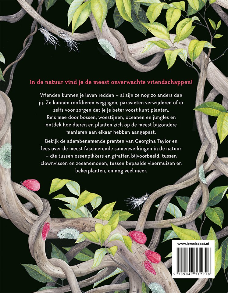 Bekijk de adembenemende prenten van Georgina Taylor en lees over de meest fascinerende samenwerkingen in de natuur die tussen ossenpikkers en giraffen bijvoorbeeld, tussen anemoonvissen en zeeanemonen, tussen bepaalde vleermuizen en bekerplanten, en nog veel meer.