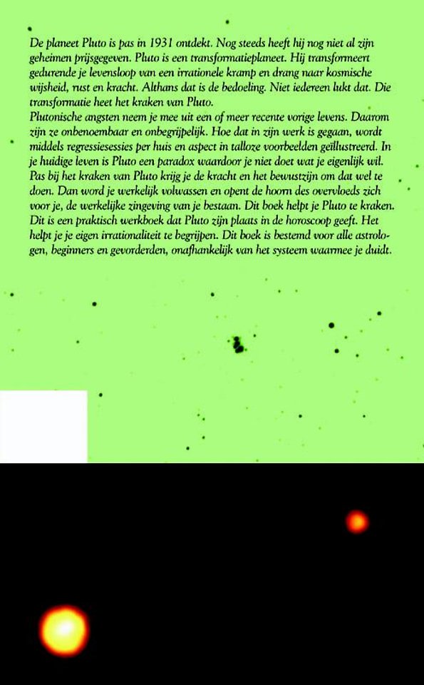Plutonische angsten neem je mee uit een of meer recente vorige levens. Daarom zijn ze onbenoembaar en onbegrijpelijk. Hoe dat in zijn werk is gegaan, wordt middels regressiesessies per huis en aspect in talloze voorbeelden geïllustreerd. In je huidige leven is Pluto een paradox waardoor je niet doet wat je eigenlijk wil. Pas bij het kraken van Pluto krijg je de kracht en het bewustzijn om dat wel te doen. Dan word je werkelijk volwassen en opent de hoorn des overvloeds zich voor je, de werkelijke zingeving van je bestaan. Dit boek helpt je Pluto te kraken. Het is een praktisch werkboek dat Pluto zijn plaats in de horoscoop geeft. Het helpt je je eigen irrationaliteit te begrijpen. Dit boek is bestemd voor alle astrologen, beginners en gevorderden, onafhankelijk van het systeem waarmee je duidt.