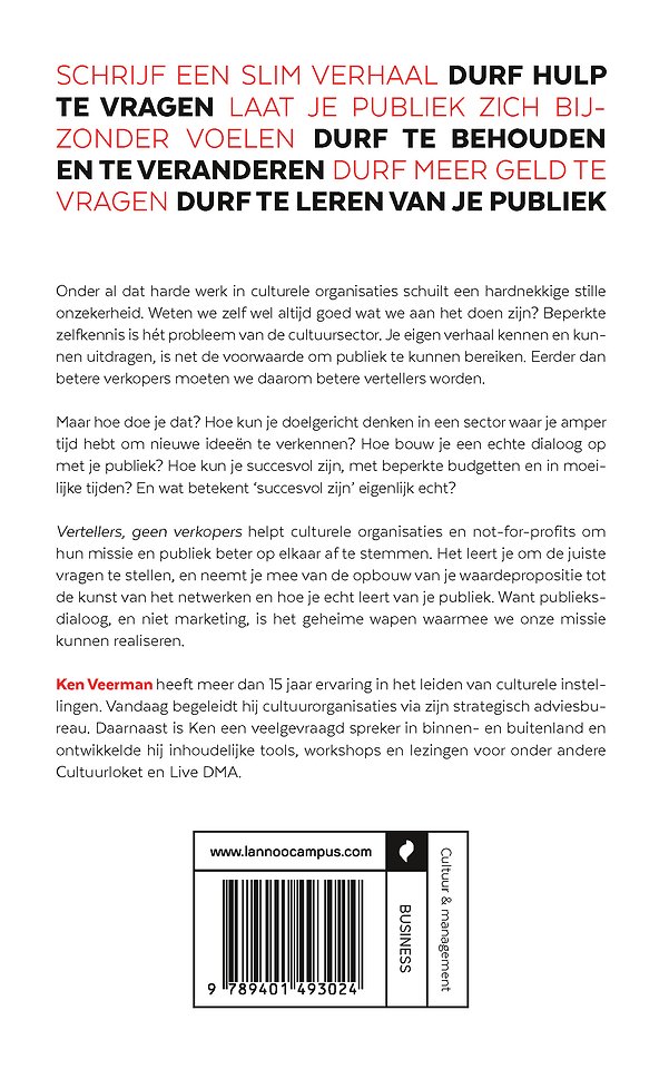 Vertellers, geen verkopers helpt culturele organisaties en not-for-profits om hun missie en publiek beter op elkaar af te stemmen. Het leert je om de juiste vragen te stellen, en neemt je mee van de opbouw van je waardepropositie tot de kunst van het netwerken en hoe je echt leert van je publiek. Want publieksdialoog, en niet marketing, is het geheime wapen waarmee we onze missie kunnen realiseren.