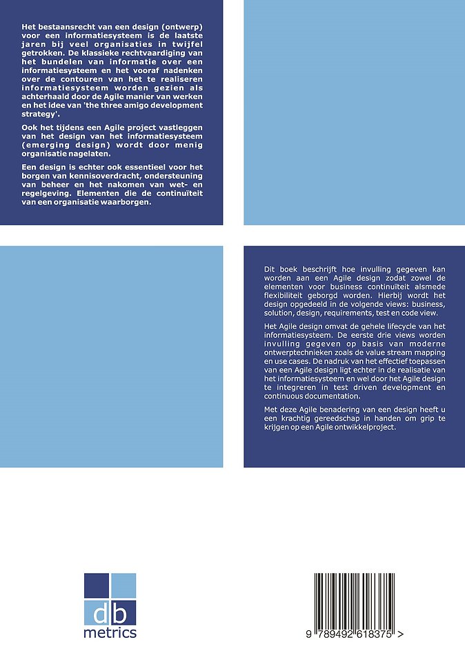 Dit boek beschrijft hoe invulling gegeven kan worden aan een Agile design, rekening houdend met het type van informatiesysteem (System of Record/System of Engagement). Hierbij wordt het design opgedeeld in de volgende views: business, solution, design, requirements, test en code view.