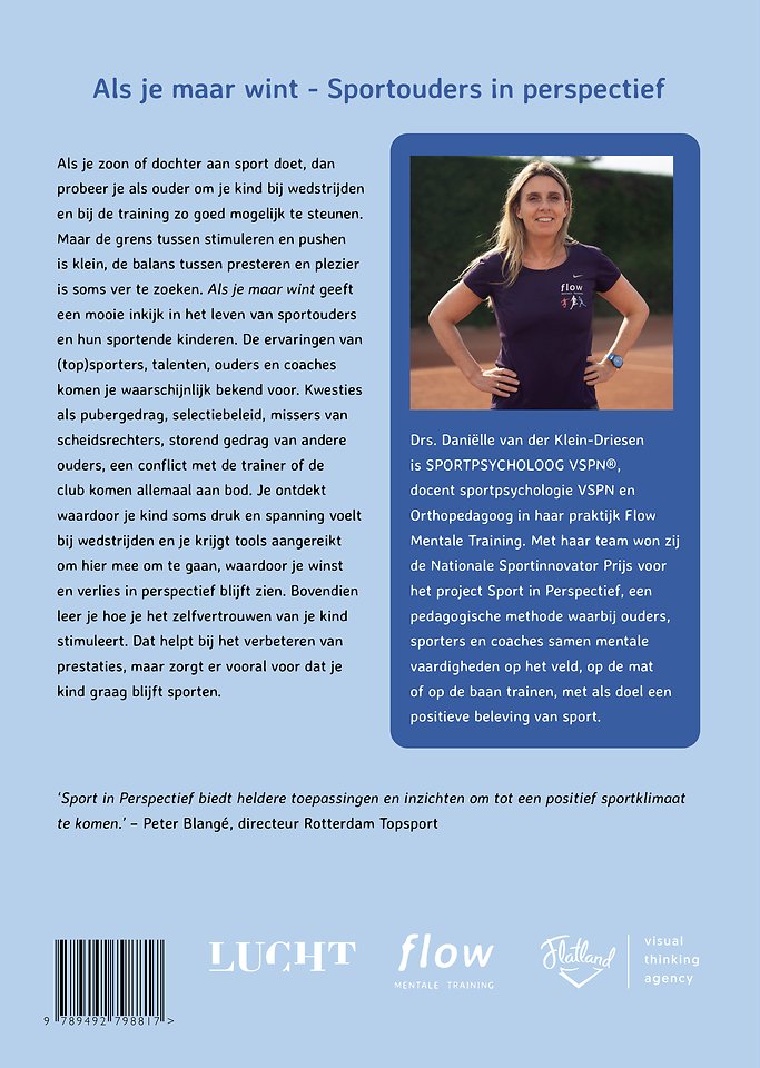 Drs. Daniëlle van der Klein-Driesen is SPORTPSYCHOLOOG VSPN®, docent sportpsychologie VSPN en Orthopedagoog in haar praktijk Flow Mentale Training. Met haar team won zij de Nationale Sportinnovator Prijs voor het project Sport in Perspectief, een pedagogische methode waarbij ouders, sporters en coaches samen mentale vaardigheden op het veld, op de mat of op de baan trainen, met als doel een
