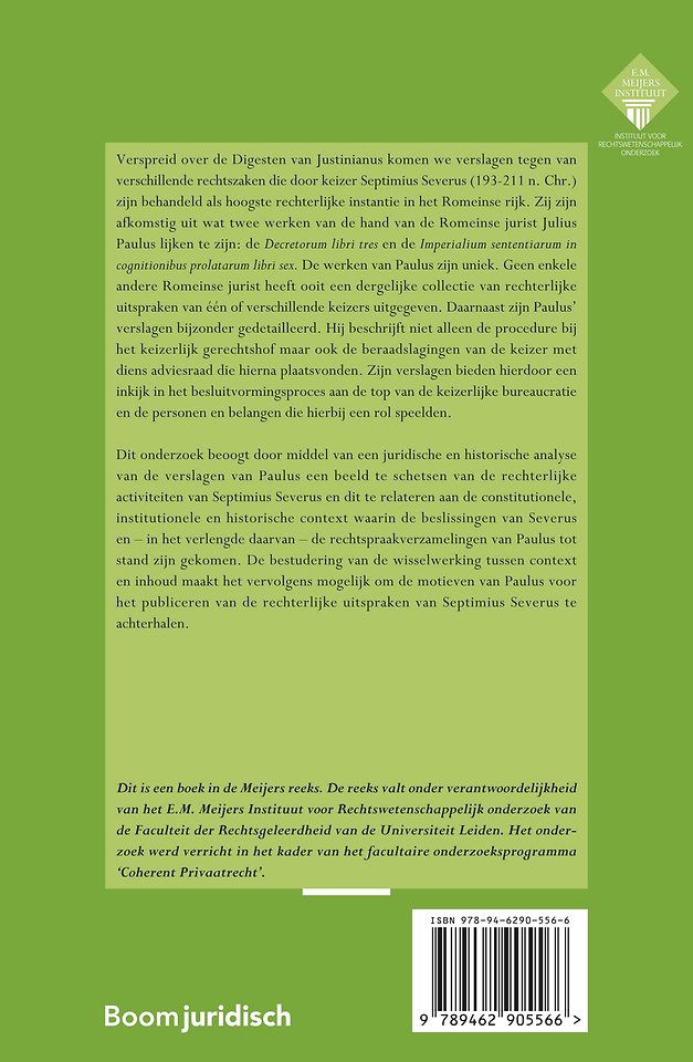 Dit onderzoek beoogt door middel van een juridische en historische analyse van de verslagen van Paulus een beeld te schetsen van de rechterlijke activiteiten van Septimius Severus en dit te relateren aan de constitutionele, institutionele en historische context waarin de beslissingen van Severus en – in het verlengde daarvan – de rechtspraakverzamelingen van Paulus tot stand zijn gekomen. De bestudering van de wisselwerking tussen context en inhoud maakt het vervolgens mogelijk om de motieven van Paulus voor het publiceren van de rechterlijke uitspraken van Septimius Severus te achterhalen.